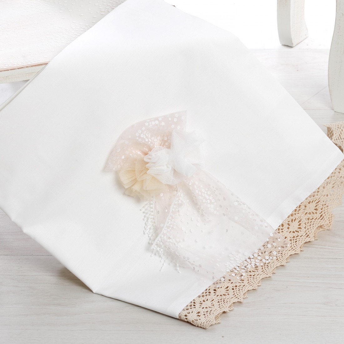 - Λαδόπανα & εσώρουχα, υψηλής ποιότητας, που περιλαμβάνουν: Μεγάλη πετσέτα διακοσμημένη με υφασμάτινο λουλούδι και δαντέλα, μικρή πετσέτα & βαμβακερά εσώρουχα (φανελάκι, σλιπάκι, σκουφάκι)