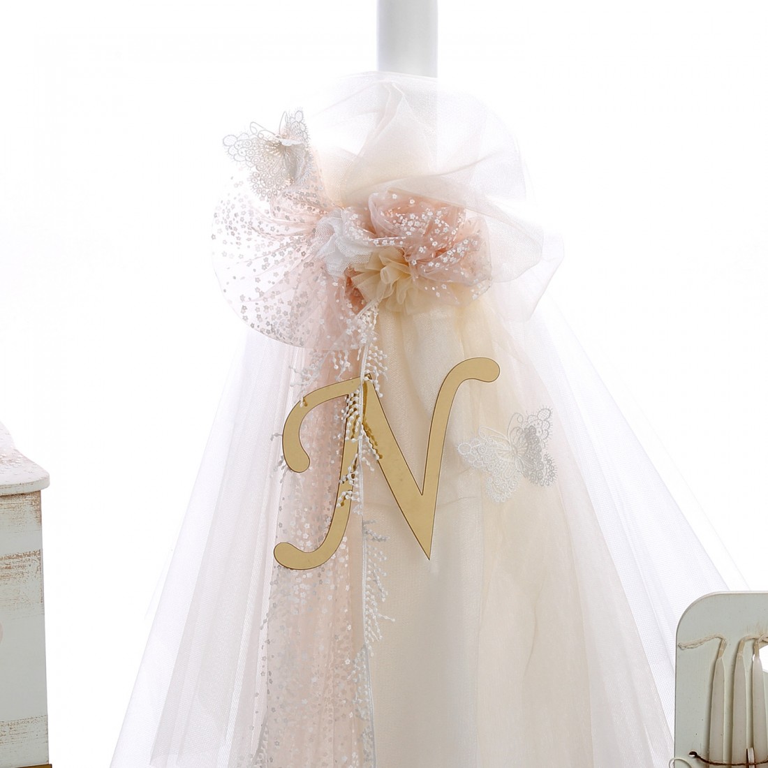 - Λαμπάδα βάπτισης, διακοσμημένη με πολυτελή τούλια, χειροποίητα λουλούδια και χρυσό plexiglass μονόγραμμα.