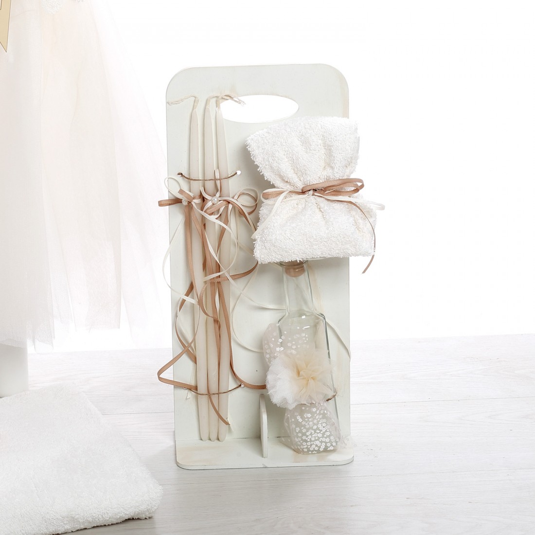 - Σετ λαδιού με μπουκαλάκι, σαπούνι και κεράκια, διακοσμημένα με φιόγκους και πέρλες.